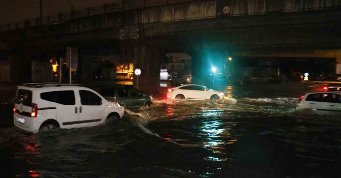 Adana'da gece yarısı kısa süreli etkili olan sağanak yağış sebebiyle yolları su bastı. Bulvarlar ve caddeler göle dönerken sürücüler ilerlemekte güçlük çekti.