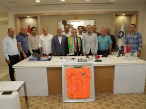 Başkan Çavuşoğlu ziyaretin anısına Başkan Muhittin Böcek’e Alanyaspor’un imzalı formasını ve atkısını hediye etti.