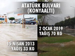Yeni yılla birlikte yağışlı havanın etkisi altına giren Antalya'da metrekareye 141 kilogram yağış düştü. Eskiden iki damla yağmurda caddeleri göle dönen Antalya’da alt yapı çalışmaların yapılmasıyla artık Antalya’da sel görüntüleri tarih oldu.