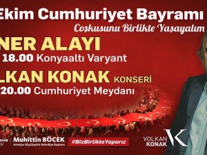 Ulu Önder Mustafa Kemal Atatürk'ün Türk Milletine armağan ettiği Cumhuriyet 96 yaşında. Antalya Büyükşehir Belediyesi de Antalyalıların Cumhuriyet Bayramı’nı coşkuyla kutlaması için Fener Alayı ve Volkan Konak konseri düzenliyor. 29 Ekim Salı günü saat 18.00’da Konyaaltı Varyantı’ndan Cumhuriyet Meydanı’na fener alayı düzenlenecek. Türk Bayrakları eşliğinde gerçekleştirilecek fener alayı yürüyüşünün ardından saat 20.00’de Cumhuriyet Meydanı’nda ünlü sarkıcı Volkan Konak Antalyalılarla buluşacak. Cumhuriyet coşkusu Volkan Konak konseri ile katlanacak.