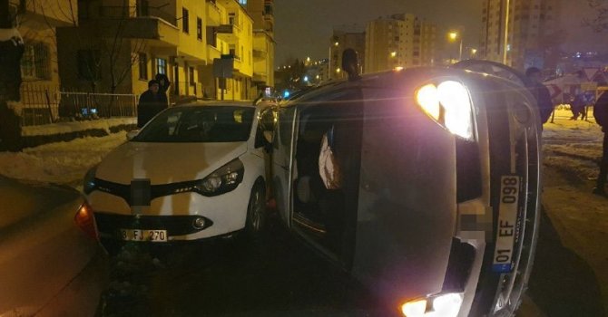 Kayseri'nin Melikgazi ilçesinde refüje çarpan otomobil, park halindeki aracın üzerine devrildi.