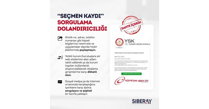 "Dolandırıcılar tarafından "Yüksek Seçim Kurulu Seçmen Sorgulama Hizmeti" başlığıyla bir link gönderiliyor. Bu linkte üzerinden seçim kaydı sorgulaması yapılması isteniyor. Sorgulama yapmak isteyen vatandaşların adres ve telefon gibi iletişim bilgileri isteniyor. Kişisel bilgilerini dolandırıcıların sistemine giren vatandaşların cep telefonlarına mesaj geliyor. Burada vatandaş YSK'nın sitesine giriş yaptığını zannediyor ancak dolandırıcıların kurduğu sahte siteye giriş yapıyor. Bu sayede dolandırıcılar vatandaşın kişisel bilgilerine erişmiş oluyor."