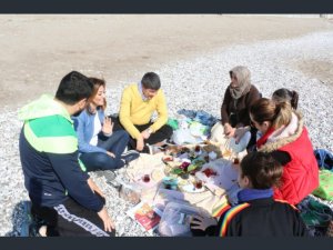 Vatandaşların Selfi isteklerini geri çevirmeyen Türel çifti, sahilde piknik yapan bir aileninin ısrarlı davetlerini kırmayarak yer sofralarına oturdular.
