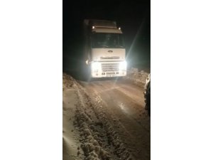 Elazığ'da kar ve buzlanmadan dolayı yolanda çıkan tır, İl Özel İdaresi ekipleri tarafından kurtarıldı.