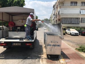 Kepez Belediyesi Temizlik İşleri Müdürlüğü ekipleri, cadde ve sokaklardaki çöp konteynerlerini kötü kokudan arındırmak ve hijyenik bir ortam sağlamak için dezenfekte ediyor.