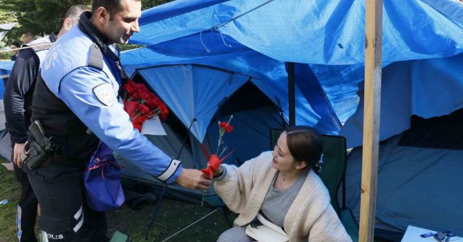 İl Emniyet Müdürlüğü Toplum Destekli Polis Şube Müdürlüğü ekipleri, depremden dolayı çadırlarda kalan kadınların 8 Mart Dünya Kadınlar Gününü kutlamaya başladı. İl Emniyet Müdürü Doğan İnci'nin talimatıyla ekipler, parklarda çadır kuran depremzede kadınları te tek ziyaret etti. Polisler karanfil vererek kadınların gününü kutlayarak hem yüzlerinde bir tebessüm oluşmasını sağladı hem de onlarla sohbet edip dertlerini dinledi.
