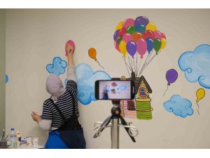 Kahramanmaraş merkezli "Asrın felaketi" olarak nitelendirilen 6 Şubat depremlerinden etkilenen bölgelerde gönüllüler, çocukların tedavi alacakları alanlarda kendilerini daha iyi hissetmeleri için duvarlara çeşitli resimler çiziyor.