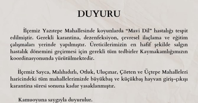 İmamoğlu Kaymakamlığı tarafından yapılan açıklamada, "Yazıtepe Mahallesi, hayvanlarda görülen mavi dil hastalığı nedeni ile karantina kararı alındı. Yazıtepe Mahallesi yakınında bulunan mahallelere karantina boyunca hayvan giriş çıkışları yasaklandı. Mahallede dezenfeksiyon, çevresel ilaçlama ve gerekli eğitim çalışmaları yapıldı" denildi.