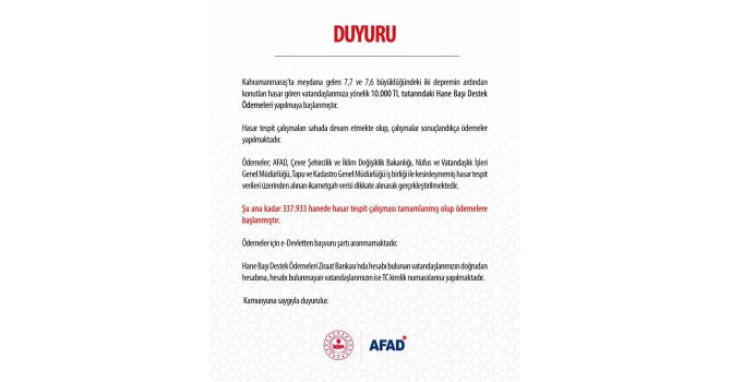 "Kahramanmaraş'ta meydana gelen 7,7 ve 7,6 büyüklüğündeki iki depremin ardından konutları hasar gören vatandaşlarımıza yönelik 10 bin TL tutarındaki Hane Başı Destek Ödemeleri yapılmaya başlanmıştır. Hasar tespit çalışmaları sahada devam etmekte olup, çalışmalar sonuçlandıkça ödemeler yapılmaktadır. Ödemeler; AFAD, Çevre Şehircilik ve İklim Değişiklik Bakanlığı, Nüfus ve Vatandaşlık İşleri Genel Müdürlüğü, Tapu ve Kadastro Genel Müdürlüğü iş birliği ile kesinleşmemiş hasar tespit verileri üzerinden alınan ikametgah verisi dikkate alınarak gerçekleştirilmektedir. Şu ana kadar 337 bin 933 hanede hasar tespit çalışması tamamlanmış olup, ödemelere başlanmıştır. Ödemeler için e-Devlet'ten başvuru şartı aranmamaktadır. Hane Başı Destek Ödemeleri Ziraat Bankası'nda hesabı bulunan vatandaşlarımızın doğrudan hesabına, hesabı bulunmayan vatandaşlarımızın ise TC kimlik numaralarına yapılmaktadır."