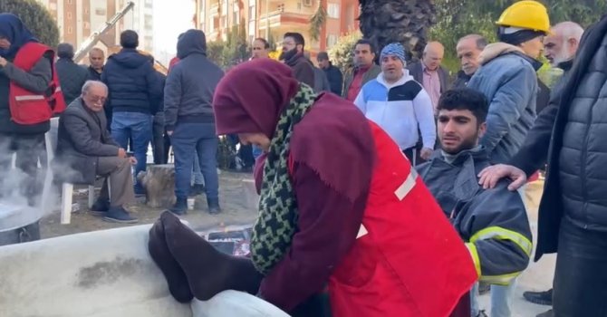 Depremin vurduğu Adana'da saatlerdir enkaz başında görev yapan arama kurtarma görevlisinin ayakları şişti. Gencin yardımına 73 yaşındaki Kızılay gönüllüsü Leman Uçar koştu. Anne şefkatiyle yaklaştığı gencin çoraplarını çıkaran Leman teyze, ayaklarına krem sürerek, masaj yaptı. O anlar görenlerin içini ısıttı.
