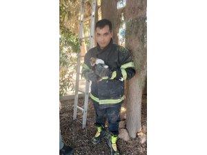 Hatay'da çıktığı ağaçtan inemeyen kediyi itfaiye ekipleri kurtardı.