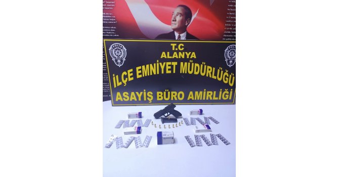 Alanya İlçe Emniyet Müdürlüğü Asayiş Büro Amirliği'ne bağlı ekipler, ilçe genelinde gerçekleştirdikleri yaya devriyesi sırasında durumundan şüphelendikleri C.G. isimli şahsı durdurdu. Yapılan üst aramasında şahsın üzerinden, 1 adet ruhsatsız tabanca, Tabancaya ait 10 adet 9.19 mm çapında fişek, 193 adet marka uyuşturucu içerikli hap ele geçirdi.