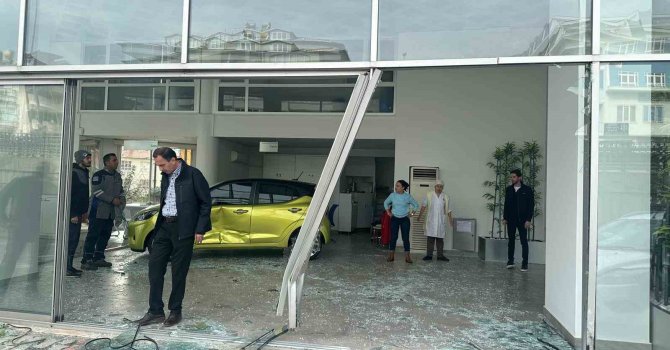 Antalya'nın Alanya ilçesinde şerit ihlali yaptıktan sonra direksiyon hakimiyetini kaybeden sürücü, otomobil satışı yapan mağazaya girdi.