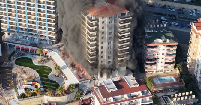 Antalya'nın Alanya ilçesinde otel inşaatında çıkan yangını söndürme çalışmaları devam ediyor. Alanya Kaymakamı Fatih Ürkmezer, "İlk aldığımız bilgi en başta 4 işçi vardı. Şu anda bütün arkadaşların dışarıda olduğu bilgisini aldık ve 3 kişi yoğun duman sebebiyle hastaneye kaldırıldı. İçeride şu anda kimse yok" dedi. Yangının başladığı anlar ise dron kamerasına yansıdı.