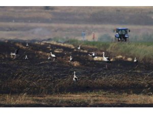 Bölgeden geçen leylek sürüleri yanmış anız yangının ortasında kaldı. Bir müddet yanan tarlada konaklayan leylekler bölgeden ayrıldı.