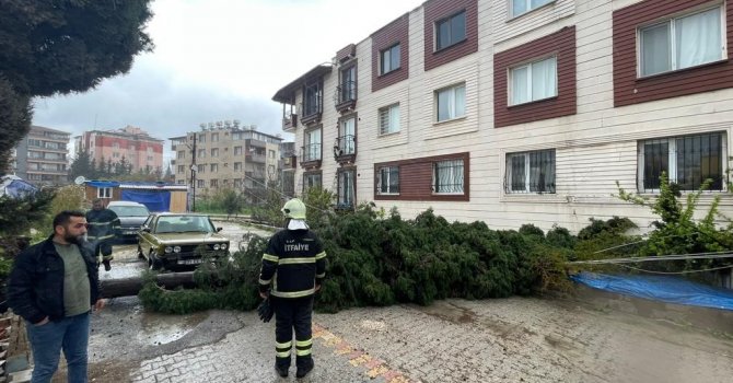 Hatay'ın Antakya ilçesinde kuvvetli fırtınanın etkisiyle ağaç yola devrildi.