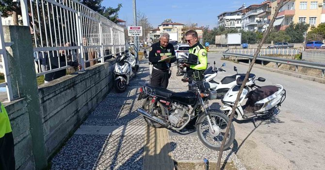 Antalya'nın Manavgat ilçesi Aşağı Pazarcı Mahallesi'nde vatandaşların ıraklık Eğitim Merkezi çevresinde plakasız motosikletlerin önü kaldırılmak suretiyle trafik güvenliğinin tehlikeye düşürüldüğü ve çevre kirliliği oluşturulduğu ihbarı üzerine ekipler bölgede denetim yaptı. Manavgat Emniyet Müdürlüğü Trafik Denetleme Büro Amirliği ekiplerince, Çıraklık Eğitim Merkezi arkasında park halindeki motosikletlerin bir çoğunun plakasının olmadığını belirlendi. Ekiplerin yaptığı sorgulamada motosikletlerden bir tanesinin motor ve şase numarasının kazınmış olduğu belirlenerek gerekli incelemeler için Emniyet Müdürlüğü bahçesine çekildi. "Plaka takmamak" suçundan 11 motosiklet trafikten men edilirken, motosiklet sahiplerine ise toplam 132 bin 513 lira para cezası uygulandı.