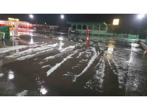 Antalya'nın Manavgat ve Serik ilçelerinde gece saatlerinde aniden bastıran dolu etkili oldu. Bilye büyüklüğündeki dolu yağışına yolda yakalanan vatandaşlar araçlarının zarar görmesini engellemek içi yakındaki akaryakıt istasyonlarına girerek yağışın bitmesini bekledi.
