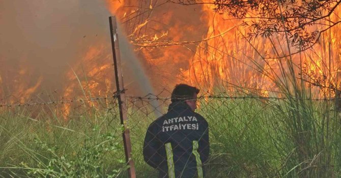 Antalya'da kargılık alanda çıkan yangın, rüzgarın etkisiyle bir anda büyüyüp bazı yerleşim yerleri ve işyerlerini tehdit etti. Yangın ile evlerin arasına girerek set olan itfaiye erleri ise, yanı başlarına kadar gelen alevlere karşı bir adım daha geri atmayıp yangının sıçramasını önledi.