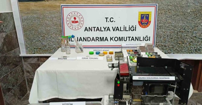 Antalya'da jandarma ekipleri tarafından 10 gram skunk, 20 adet sentetik hap, 4 gram kenevir tohumu, 4 adet esrar öğütücüsü, 30 paket doldurulmuş bandrolsüz makaron, 5 kg işlenmemiş tütün, 300 adet boş makaron, 1 adet sigara dolum makinesini ele geçirildi.