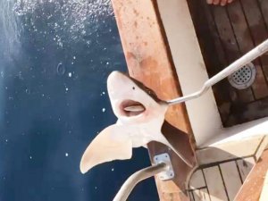 Av için denize açılan balıkçıların oltasına 2 metre boyunda Pamuk cinsi köpek balığı takıldı. Sabah saatlerinde oltalarına takılan köpek balığını görünce şaşkına döndü. Balığı kanca ile teklerine alan balıkçılar sosyal medya paylaşımları ile olayı duyurdu.
