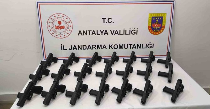 Antalya'da bir eve düzenlenen operasyonda 21 ruhsatsız tabanca, 21 şarjör ve 14 fişek bulundu. Gözaltına alınan şüpheli tutuklandı.