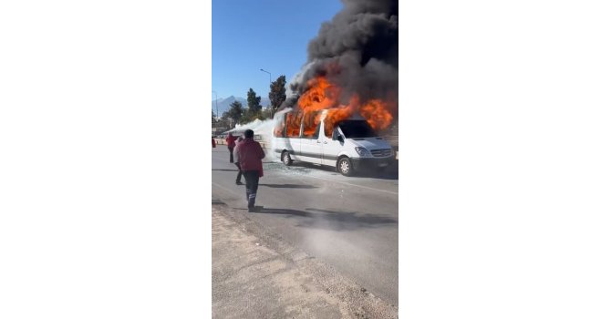 Antalya'da dumanların çıktığı servis minibüsü kısa sürede alevlere teslim oldu. Sürücülerin ve bir trafik polisinin yangın tüpü ile müdahale ettiği minibüs kullanılamaz hale geldi.