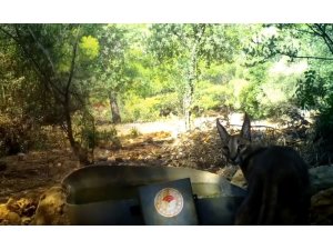 Antalya'da sıcak havadan etkilenen yaban hayvanlarının serinlemesi ve su ihtiyaçlarının giderilmesi için daha önce konulan su yalaklarından hayvanların su içmeleri fotokapan görüntülerine yansıdı.