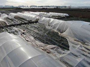 Antalya'da dün etkili olan şiddetli fırtına ve yağmur, Aksu ilçesinde çilek seralarını vurdu. Çilek seralarının örtüleri yırtılırken demir direkleri yerinden söküldü.