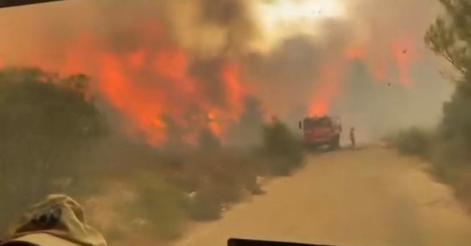 Serik ilçesi Yumaklar bölgesinde bugün saat 14.00'te ilk tespitlere göre elektrik direğinin devrilmesi sonucu çıkan yangın kısmen kontrol altına alınırken, yangının ilk saatlerinde çekilen bir görüntü yürekleri ağza getirdi. Orman İşletme Müdürlüğüne ait arazöz ve Serik Belediyesine ait su ikmal aracı ile iş makinesi yangına müdahale ederken birdenbire rüzgarın etkisi ile yükselen alevler ekiplere zor anlar yaşattı. Alevlerin arazöz ve iş makinesine ulaşmasına sadece birkaç metrenin kaldığı o anlarda yaşanan panik görüntülere yansıdı. Olay anı cep telefonu kamerası ile anbean kaydedildi.