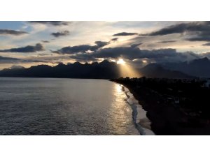 Antalya'da kendisine hayran bırakan ve her yıl milyonlarca turisti ağırlayan Konyaaltı Sahili'de drone ile çekilen gün batımı kartpostallık görüntüler ortaya çıkardı. Güneşin batmasıyla birlikte bulutların arasından görünen ışık hüzmesi ise izleyenleri mest etti.