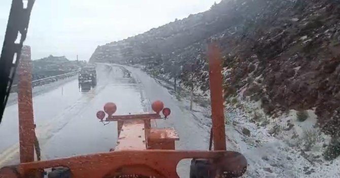 Antalya'yı Konya'ya bağlayan Akseki-Seydişehir karayolunda dolu yağışı etkili oldu, Alacabel'de kar görüntülerini aratmayan manzara ortaya çıktı. Ekipler küreme çalışması yaptı.