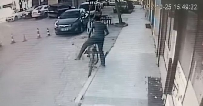 Bisikletin çalınma anı ise güvenlik kamerasına yansıdı. Görüntüde şahsın bisikleti gözüne kestirip, binanın çevresinde gezmesi, iş yerini önünde eli arkasında bir ileri bir geri gittiği ve kimsenin olmadığını anladığı anda binip gittiği anlar yer aldı.