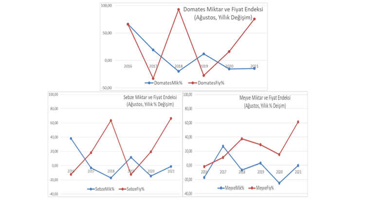 Domates fiyat endeksi geçen yılın Ağustos ayına göre (yıllık) yüzde 75.93’lük artış gösterirken, bu artış 2018 yılından sonraki en yüksek Ağustos ayı artışı oldu. Ağustos ayı yıllık gerçekleşmelerde sebze miktar endeksindeki yüzde 1.11’lik azalışa karşılık fiyat endeksinde yüzde 66.45’lik artış oldu. Fiyattaki bu artış son 6 yılın Ağustos ayı rekoru olarak kaydedildi. Meyve miktar endeksindeki yıllık yüzde 0.10’luk azalışa karşılık fiyat endeksi yüzde 61.63’lük artış gösterdi. Meyve fiyatlarındaki bu artış da son 6 yılın rekoru oldu.
