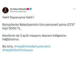 Bahçelievler Belediye Başkanı Dr. Hakan Bahadır sosyal medya hesaplarından yaptığı paylaşımda, "Vakit dayanışma vakti. Bahçelievler Belediyemizin tüm personeli adına (2 bin 737 kişi) 5 bin TL. Kendimin de 3 aylık maaşımı deprem bölgesine bağışlıyoruz. Biz biriz #HepBirlikteBahçelievleriz ve #HepBirlikteTürkiyeyiz" ifadelerine yer verdi.
