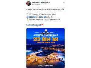 Ulaştırma ve Altyapı Bakanı Abdulkadir Uraloğlu, "Antalya Havalimanı rekordan rekora koşuyor, 20 Temmuz 2024 Cumartesi günü 213 bin 161 yolcu ile 2024'ün en yüksek yolcu sayısına ulaştık" ifadelerini kullandı.