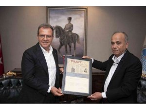 Merzeci ayrıca Vakit Gazetesi'nde yer alan haberin de taranmış ve çerçevelenmiş halini Başkan Seçer'e takdim ederken, Zekiye Halil Olgaçay hakkında da bilgiler paylaştı.