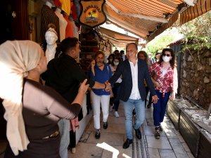 Belediye Başkanı Uysal da eşi Ümran Uysal’la birlikte festival sokaklarını ziyaret etti, sanatçılarla, yazarlarla bir araya geldi. Başkan Uysal’ın ilk adresi, resim çalışmalarını vefat ettiği 2016 yılına kadar Kaleiçi’nde sürdüren ressam Muhittin Selamet anısına ‘Kaleiçi Seninle Güzeldir’ başlığı altında çalıştayın yapıldığı Kandiller Sokak oldu. Küratörlüğünü Doç. Dr. Terlan Mehdiyeva Azizzade’nin yaptığı çalıştayda, Başkan Uysal ve eşi, tuvallerin başında sokakta resim yapan sanatçılarla sohbet etti.