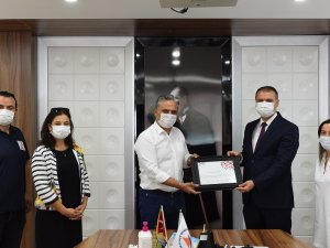 Türk Kızılay Batı Akdeniz Bölge Kan Merkezi Müdürü Dr. Tufan Ertop, Türk Kızılay Batı Akdeniz Kök Hücre Sorumlusu Pınar Gümrükçüoğlu ve febotamist Tarık Kayoz, Başkan Uysal’ı makamında ziyaret etti.