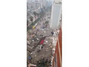 Kahramanmaraş'ta 7,4 büyüklüğünde meydana gelen depremde birçok bina yıkılırken, son durumu bir binadan çekilen görüntüler gözler önüne serdi.