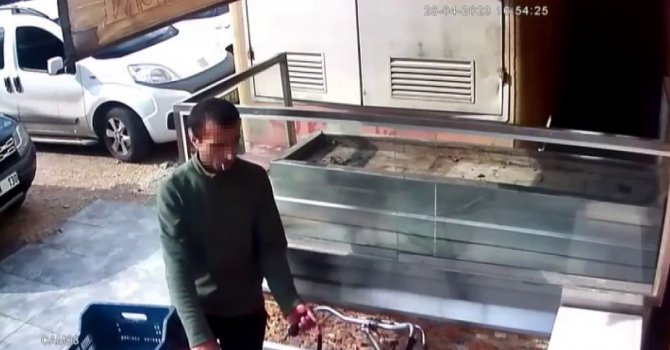 Adana'da bir hırsızın önce dişini kürdanla karıştırıp sonra kebapçının önünde duran bisikleti çalma anı güvenlik kamerasına saniye saniye yansıdı.
