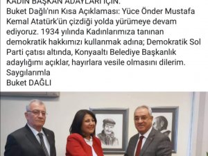 Bukat Dağlı adaylık sonrası açıklamalarda bulundu. Dağlı, "Yüce Önder Mustafa Kemal Atatürk'ün çizdiği yolda yürümeye devam ediyoruz. 1934 yılında Kadınlarımıza tanınan demokratik hakkımızı kullanmak adına; Demokratik Sol Parti çatısı altında, Konyaaltı Belediye Başkanlık adaylığımı açıklar, hayırlara vesile olmasını dilerim" dedi. HABER MERKEZİ