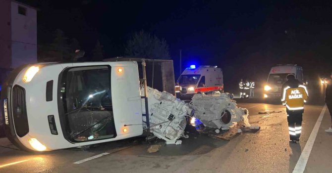 Burdur'un Çeltikçi ilçesinde lastiği patlayan tekne motoru yüklü kamyonet devrildi. Kazada 2 kişi yaralandı.