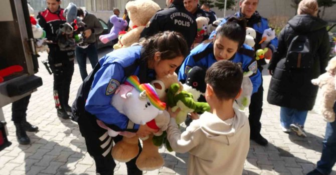 Burdur İl Emniyet Müdürlüğüne bağlı polis ekipleri yurtta kalan depremzede çocuklara 500 oyuncak dağıttı.