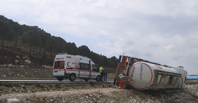Burdur-Fethiye karayolunda akaryakıt tankeri kontrolden çıkarak şarampole devrildi, araç sürücüsü yaralandı.