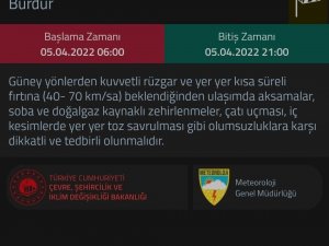 Meteoroloji Genel Müdürlüğü'nden alınan bilgilere göre, Burdur'da yarın için kuvvetli rüzgar ve fırtına uyarısı yapıldı. Vatandaşlar fırtınadan kaynaklı olumsuzluklara karşı uyarıldığı açıklamada, "Güney yönlerden kuvvetli rüzgar ve hızı saatte 40-70 kilometre olan fırtına bekleniyor. Ulaşımda aksamalar, soba ve doğalgaz kaynaklı zehirlenmeler, çatı uçması, iç kesimlerdeki toz savrulmalarına karşı tedbirli olunmalıdır" ifadeleri yer aldı.