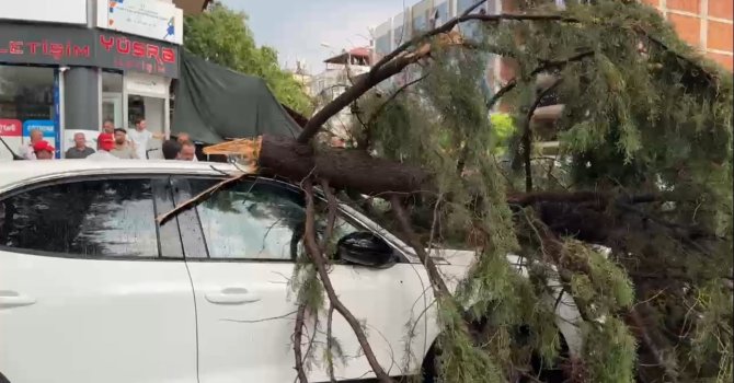 Burdur'un Bucak ilçesinde akşam saatlerinde etkili olan fırtınada kırılan ağaç, park halindeki otomobilin üzerine devrildi.