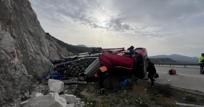 Burdur Antalya karayolunda kontrolden çıkarak şarampole devrilen tırda bulunan 2 kişi yaralandı.