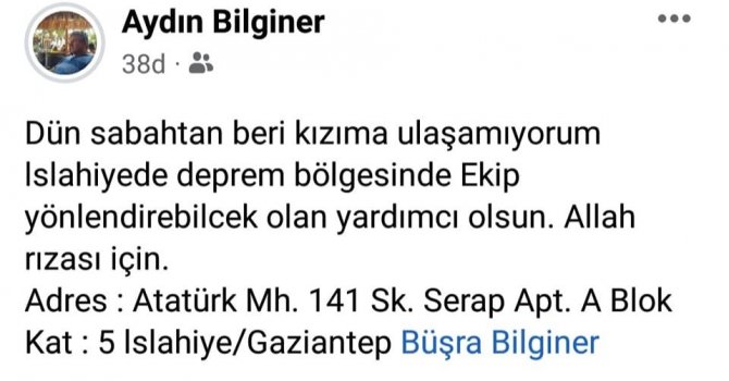 Sömestri tatilinin ardından geçtiğimiz Pazar günü memleketi Sultanhisar'dan görev yeri olan Gaziantep'in İslahiye ilçesine giden İngilizce Öğretmeni Büşra Aydıner'de büyük depremde göçük altında kalarak hayatını kaybetti. Pazartesi sabahından bu yana evin tek çocuğu olan kızları Büşra'dan haber alamayan aile bu sabaha karşı aldıkları acı haber karşısında yıkıldı.