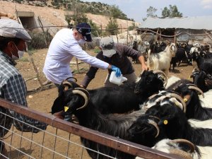 Korkuteli’de küçükbaş hayvan yetiştiricilerine pandemi kapsamında bilinçlendirici eğitimler veren veteriner hekimler, daha sonra 800 küçükbaş hayvana iç-dış parazit ilacı uygulaması yaptı.